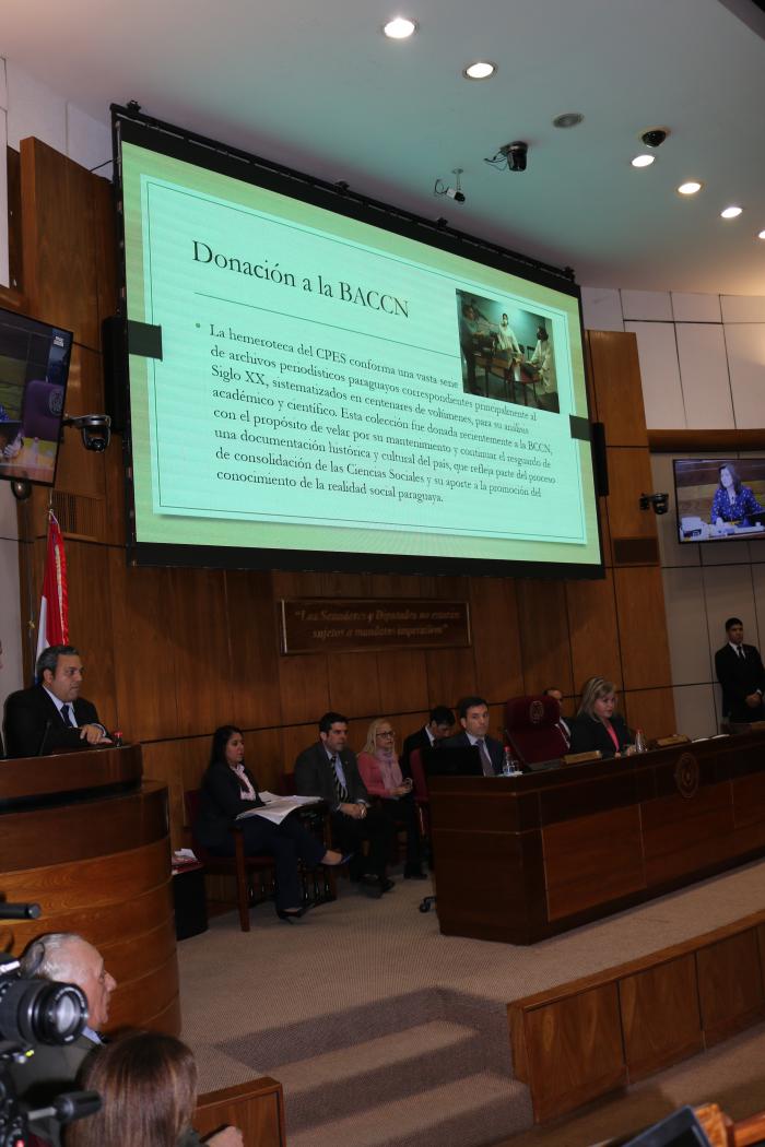 El día de hoy en la Cámara de Senadores se realizó un homenaje al Centro Paraguayo de Estudios Sociológicos (CPES) por sus 55 años de labor en las ciencias sociales y por una valiosa donación a la hemeroteca de la Biblioteca y Archivo Central del Congreso de la Nación con periódicos correspondientes al principio del siglo XX. Dicha donación fue gestionada por la Senadora Blanca Ovelar.